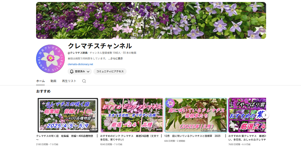 私が作成しているクレマチスの動画をまとめているチャンネルです。病院の待合室の動画に流しているような花のみの動画、クレマチスの育て方も公開しています。私が考案した挿し木の方法なども載せていますので、興味がある方はご覧ください。